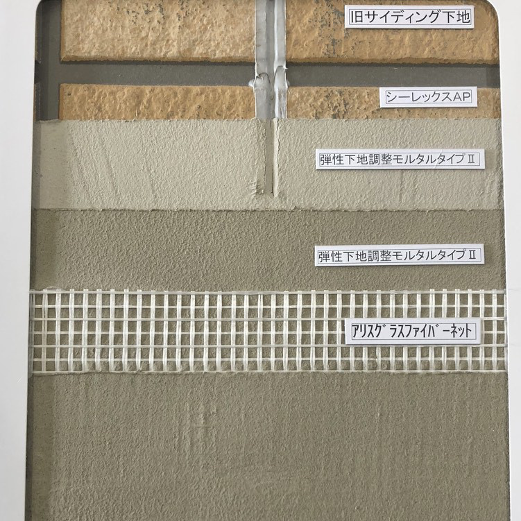 「外壁デザインリノベ」は既存のサイディングの上から、丈夫な繊維を巻き付けて特殊樹脂で壁を再整形させる工法です。