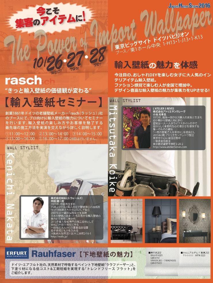 チェントコローレではドイツの壁紙メーカー「Raschラッシュ」ブースにて展示とプロによる貼り方教室を開催し、輸入壁紙の魅力や楽しみ方について説明いたします。
